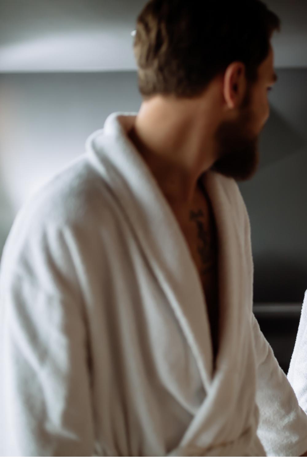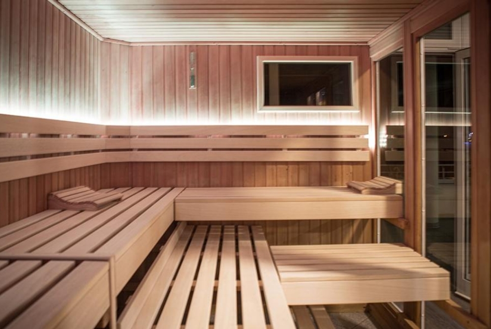 _ Kurz abduschen, abtrocknen, 10 bis 20 Minuten in die Sauna oder Infrarotkabine sitzen. Danach 5 Minuten frische Luft auf der Außenterrasse schnappen und dann kalt abduschen: mit dem Eiseimer – wenn du dich traust. Ruhe dich anschließend im Ruhebereich aus.
